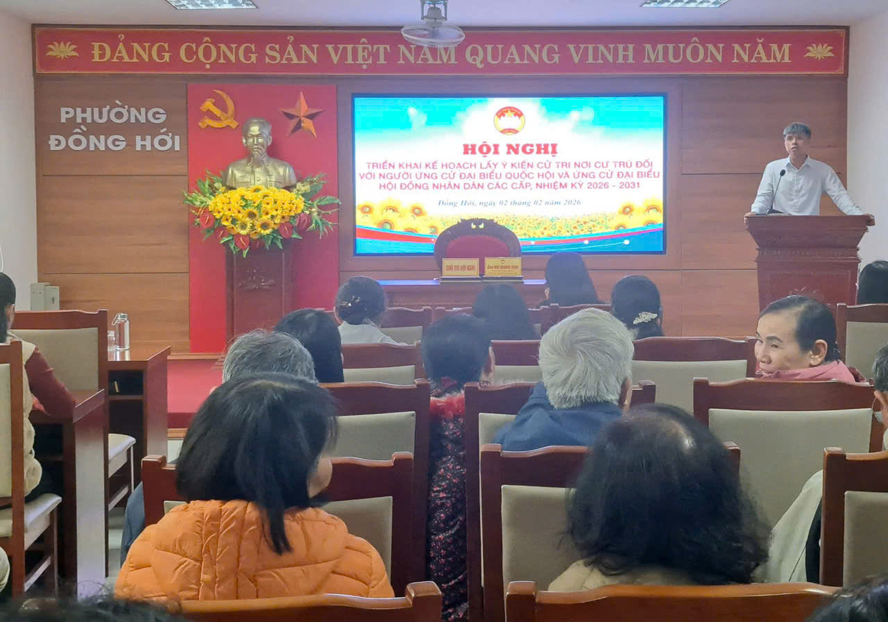 Theo kế hoạch, toàn phường sẽ tổ chức 52 hội nghị tại nhà văn hóa các tổ dân phố để lấy ý kiến nhận xét và tín nhiệm đối với hơn 140 người ứng cử đại biểu HĐND phường khóa II, nhiệm kỳ 2026 - 2031 và người ứng cử đại biểu Quốc hội, đại biểu HĐND các cấp đang cư trú trên địa bàn phường Đồng Hới. Các hội nghị lấy ý kiến cử tri nơi cư trú sẽ được tổ chức từ ngày 04/2 đến 08/2/2026.