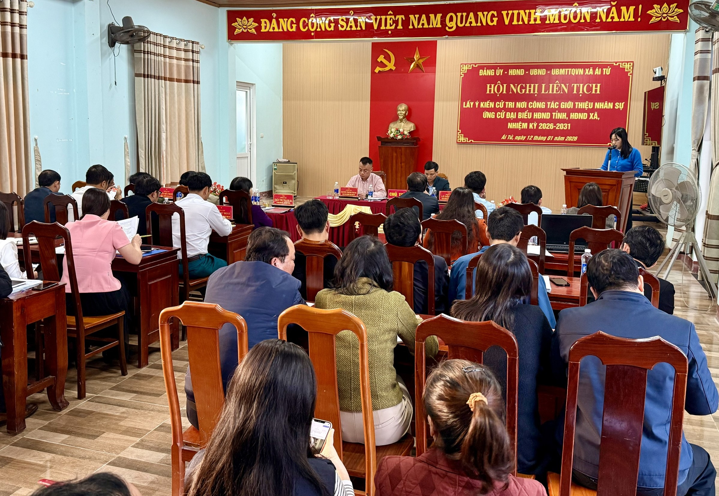 Hội nghị đã tiến hành biểu quyết thể hiện sự tín nhiệm đối với danh sách người được giới thiệu ứng cử bằng hình thức giơ tay. Kết quả, 100% cử tri tham dự hội nghị nhất trí, thống nhất cao đối với danh sách những người được giới thiệu ứng cử đại biểu HĐND tỉnh, HĐND xã nhiệm kỳ 2026 - 2031.