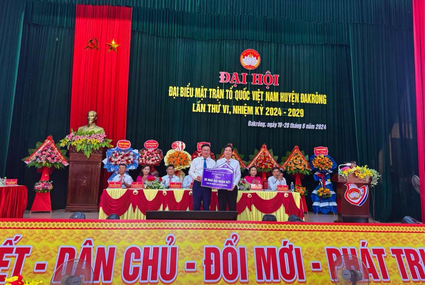 Đồng chí Chủ tịch Ủy ban MTTQVN tỉnh cũng yêu cầu MTTQ Việt Nam huyện khóa VI cụ thể hóa chương trình hành động của Đại hội vào hiện thực trong cuộc sống, tiếp tục đẩy mạnh phong trào thi đua yêu nước trong cả hệ thống chính trị và mọi tầng lớp Nhân dân, phát huy truyền thống, sức mạnh đại đoàn kết toàn dân, thực hiện dân chủ xã hội, nỗ lực phấn đấu, quyết tâm xây dựng Đakrông phát triển bền vững. Đặc biệt, cần phát huy tốt vai trò nòng cốt trong tuyên truyền, vận động nhân dân phát huy tiềm năng, thế mạnh của địa phương tham gia phát triển kinh tế - xã hội, bảo đảm quốc phòng-an ninh của huyện Phát huy sức mạnh khối đại đoàn kết toàn dân; nâng cao vai trò nòng cốt chính trị của mặt trận tổ quốc việt nam; thực hành dân chủ xã hội; xây dựng huyện đakrông phát triển bền vững. Cũng tại Đại hội Ban chỉ đạo Đề án 197- Uỷ ban MTTQ Việt Nam tỉnh tặng 30 nhà Đại đoàn kết cho các hộ nghèo trên đìa bàn huyện Đakrông.