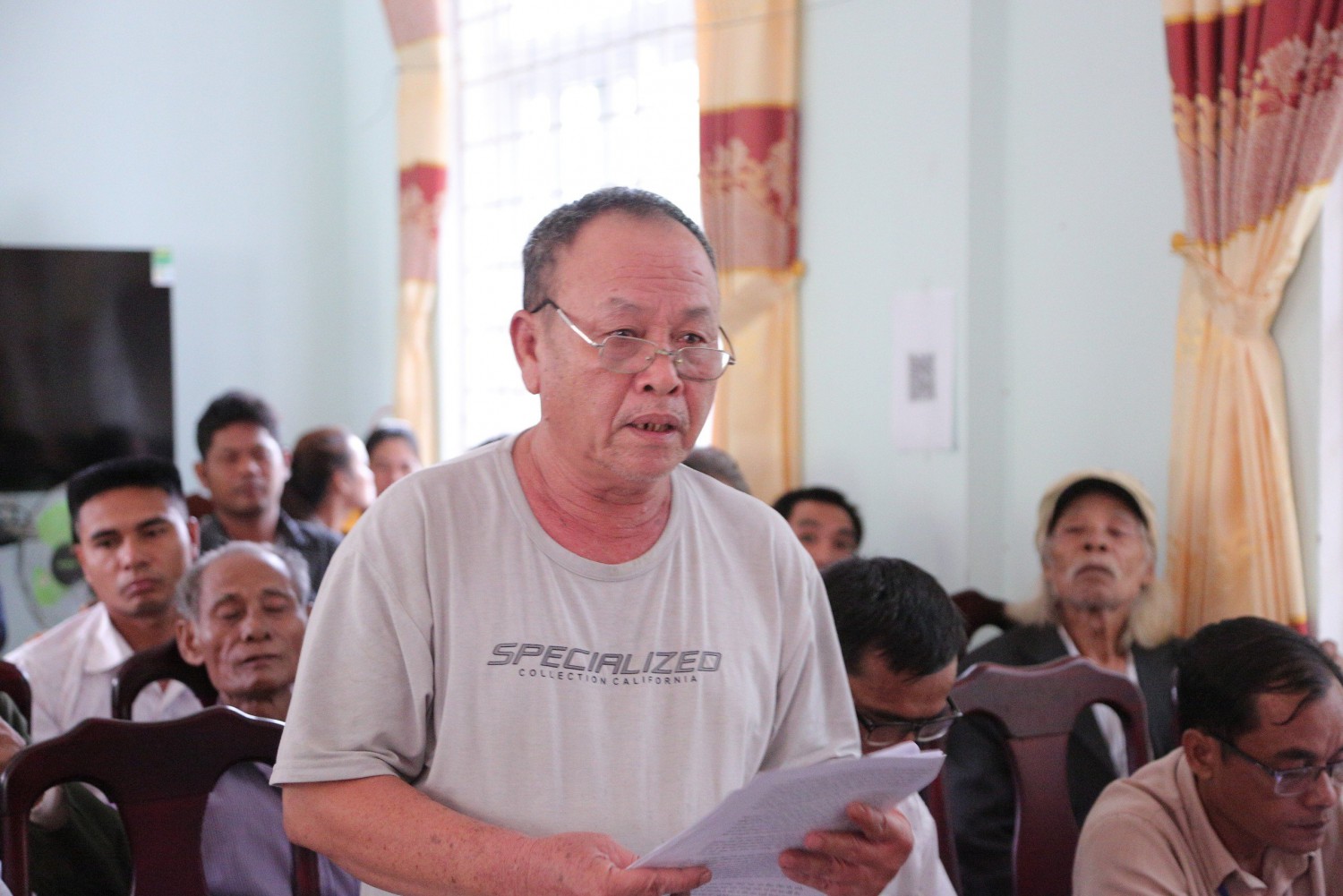 Cử tri xã Vĩnh Ô, huyện Vĩnh Linh phát biểu kiến nghị tháo gỡ khó khăn về đất đai cho địa phương - Ảnh: Lê Minh