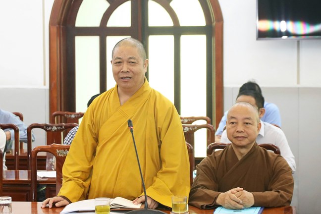 Hòa thượng Thích Thọ Lạc, Phó Truởng ban Thường trực Ban Trị sự Giáo hội Phật giáo tỉnh Nghệ An phát biểu tại Hội thảo
