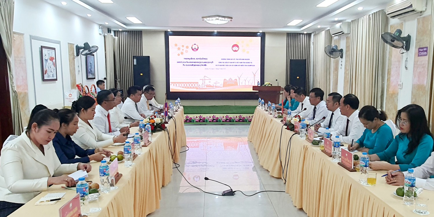 QTO - Chiều nay 11/9, tại TP. Đông Hà đã diễn ra chương trình gặp gỡ, trao đổi kinh nghiệm công tác giữa Ủy ban MTTQ Việt Nam tỉnh Quảng Trị và Ủy ban Mặt trận (UBMT) Lào xây dựng đất nước tỉnh Champasak. Chủ tịch Ủy ban MTTQ Việt Nam tỉnh Đào Mạnh Hùng và Chủ tịch UBMT Lào xây dựng đất nước tỉnh Champasak Vạt - sạ - nả Sỷ - ly- ma tham dự chương trình.