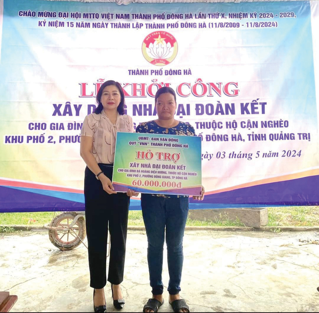 Chủ tịch Ủy ban MTTQ Việt nam thành phố Đông Hà Nguyễn Hồng Hải trao bảng tượng trưng hỗ trợ xây dựng nhà đại đoàn kết cho bà Nguyễn Thị Giáp ở khu phố 1, Phường 4 - Ảnh: K.S