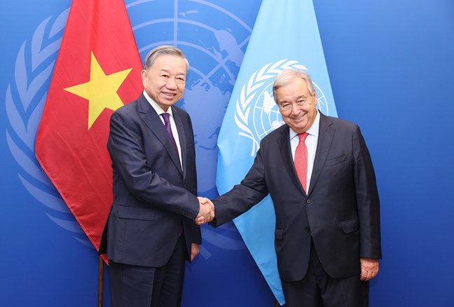 Tổng Bí thư, Chủ tịch nước Tô Lâm gặp Tổng thư ký Liên hợp quốc Antonio Guterres nhân dịp tham dự Đại hội đồng Liên hợp quốc khóa 79 và làm việc tại Hoa Kỳ _Ảnh: TTXVN