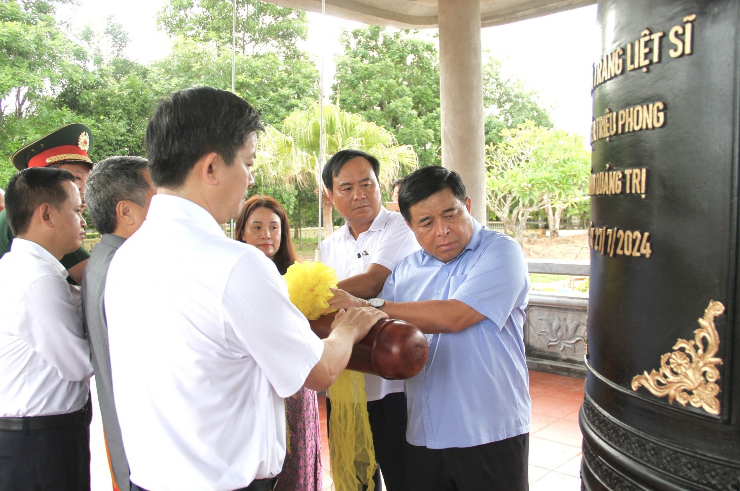 Bộ trưởng Bộ KH&ĐT Nguyễn Chí Dũng, lãnh đạo tỉnh Quảng Trị thỉnh chuông tại Nghĩa trang liệt sĩ huyện Triệu Phong - Ảnh: MĐ