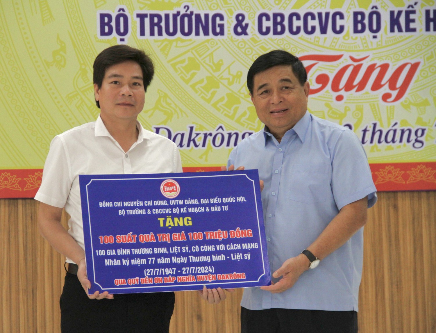Cũng trong chiều nay 22/7, đoàn công tác của Bộ KH&ĐT do UVTƯ Đảng, Bộ trưởng Bộ KH&ĐT Nguyễn Chí Dũng làm trưởng đoàn đến thăm, tặng quà cho gia đình có công với cách mạng, đối tượng chính sách tại huyện Đakrông nhân kỷ niệm 77 năm ngày Thương binh - Liệt sĩ 27/7 (1947-2024).