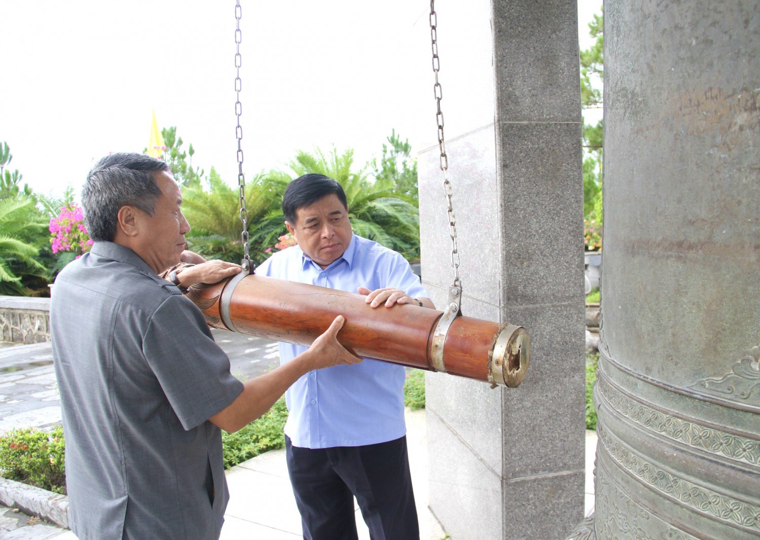 Bộ trưởng Bộ KH&ĐT Nguyễn Chí Dũng và Phó Chủ tịch Thường trực UBND tỉnh Hà Sỹ Đồng thỉnh chuông tại Nghĩa trang liệt sĩ quốc gia Đường 9 - Ảnh: MĐ