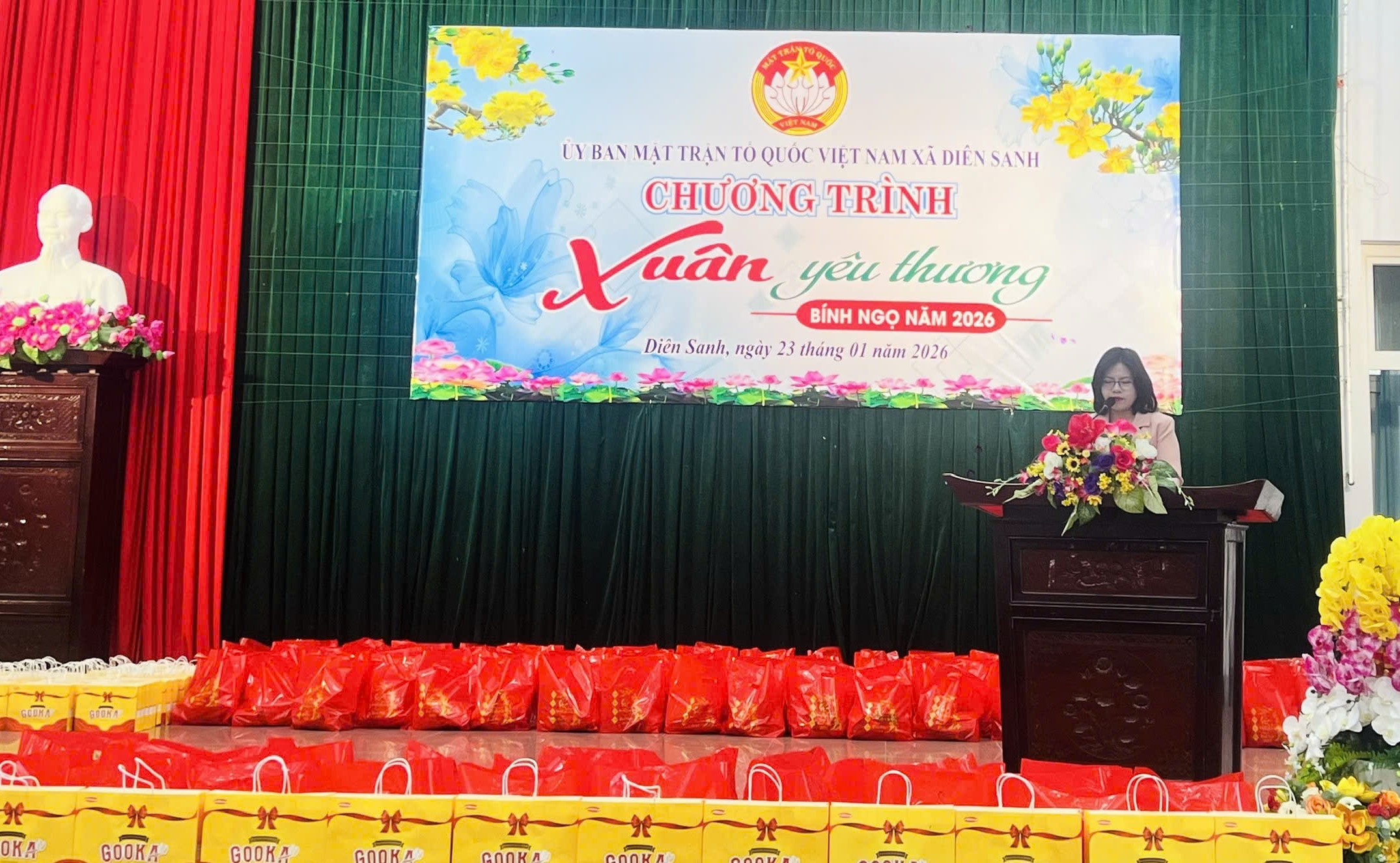 Phát biểu tại chương trình, bà Nguyễn Thị Phương Liễu - Chủ tịch Ủy ban Mặt trận Tổ quốc Việt Nam xã Diên Sanh nhấn mạnh: Chương trình “Xuân yêu thương” là hoạt động có ý nghĩa nhân văn sâu sắc, thể hiện sự quan tâm, trách nhiệm của cấp ủy, chính quyền, Mặt trận Tổ quốc và các tổ chức chính trị - xã hội các cấp đối với các hộ nghèo, hộ có hoàn cảnh khó khăn; qua đó góp phần lan tỏa tinh thần đoàn kết, sẻ chia, phát huy truyền thống tốt đẹp “lá lành đùm lá rách” của dân tộc. Chủ tịch Ủy ban Mặt trận Tổ quốc Việt Nam xã bày tỏ mong muốn trong thời gian tới, địa phương tiếp tục nhận được sự quan tâm, đồng hành của các cơ quan, đơn vị, doanh nghiệp và các nhà hảo tâm trong công tác an sinh xã hội, chung tay cùng Mặt trận chăm lo ngày càng tốt hơn cho đời sống Nhân dân, nhất là các đối tượng yếu thế.