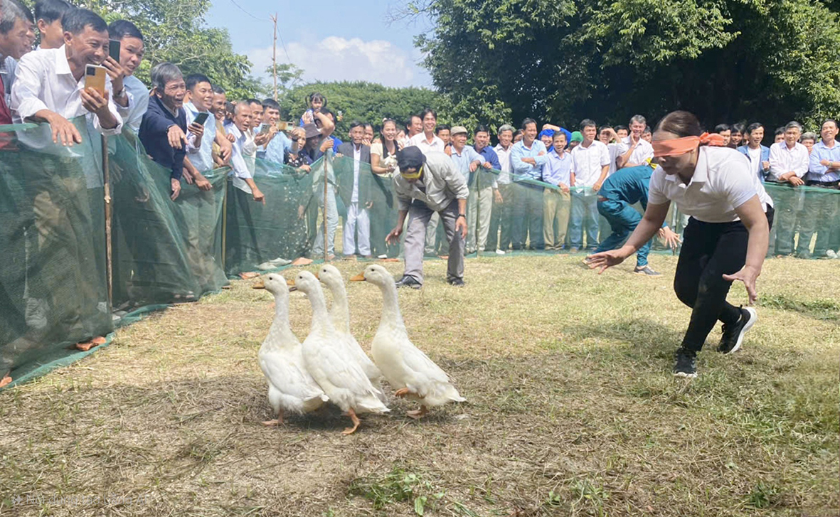 Trò chơi dân gian bịt mắt bắt vịt tại Ngày hội Đại đoàn kết toàn dân tộc năm 2024 ở khu dân cư Tân Phong, xã Hải Chánh - Ảnh: MTHL