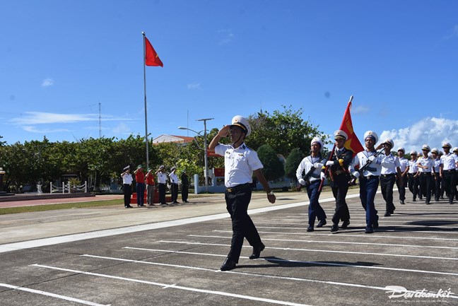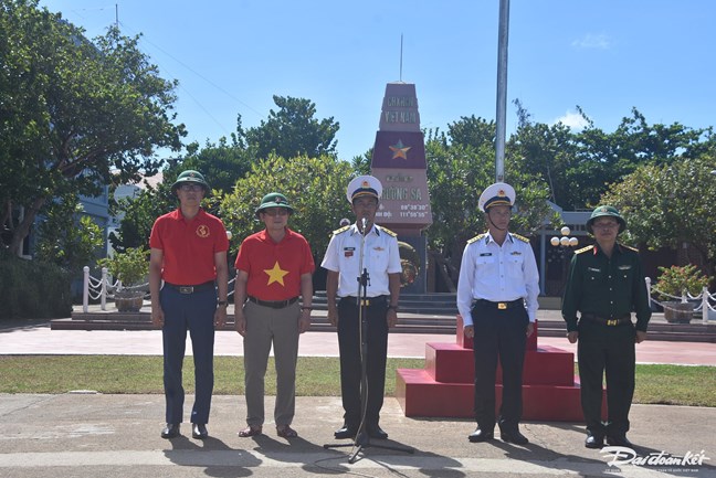 Phó Chủ tịch Ủy ban Trung ương MTTQ Việt Nam Nguyễn Hữu Dũng cùng Đoàn công tác đã tham gia chào cờ, duyệt đội ngũ trên đảo Trường Sa lớn.