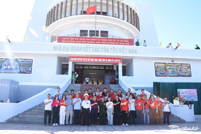 Các đại biểu chụp ảnh lưu niệm tại Nhà Đại đoàn kết các dân tộc việt Nam trên đảo Đá Tây A. Đây là công trình có ý nghĩa quan trọng do MTTQ Việt Nam vận động tài trợ.