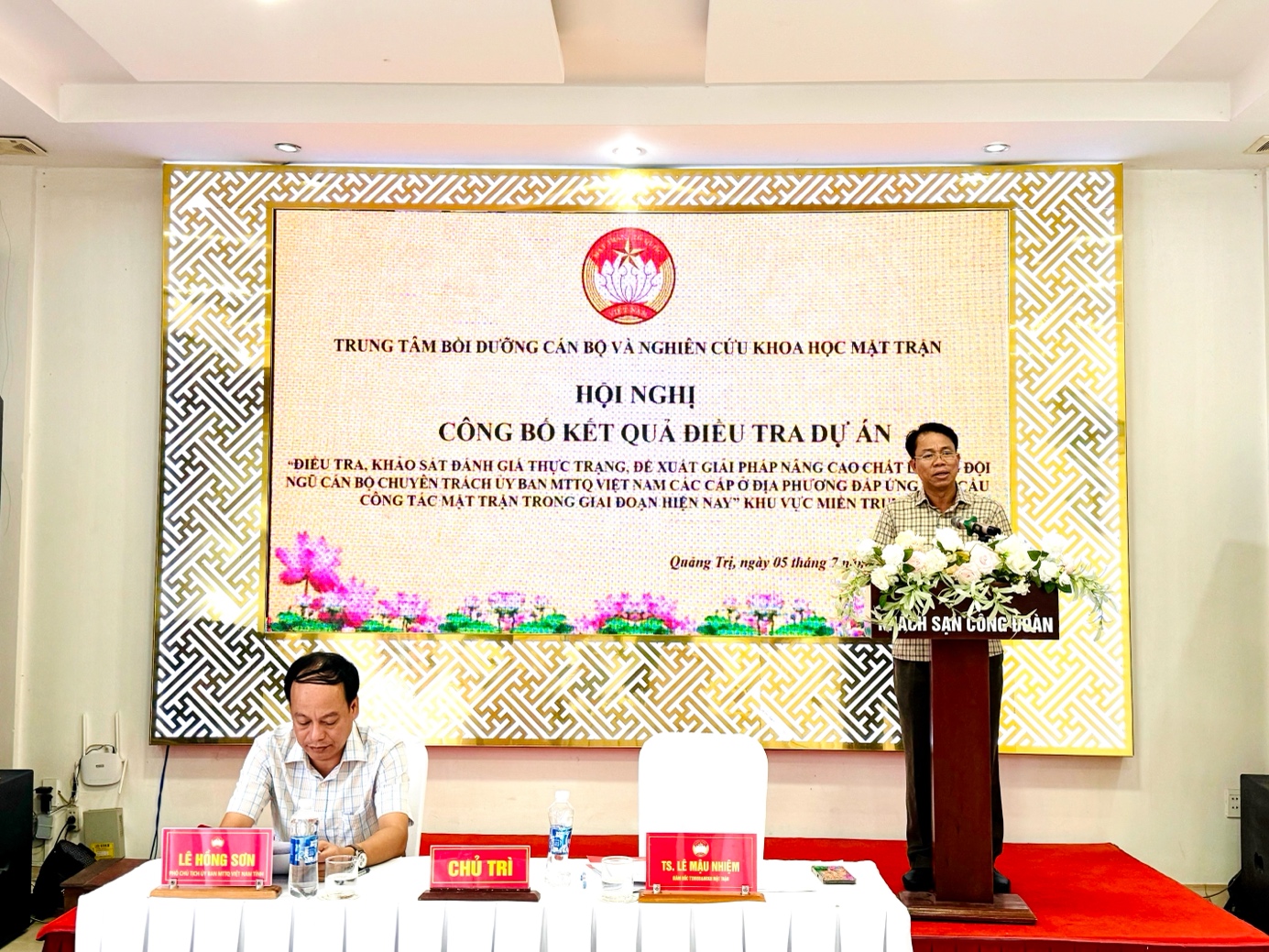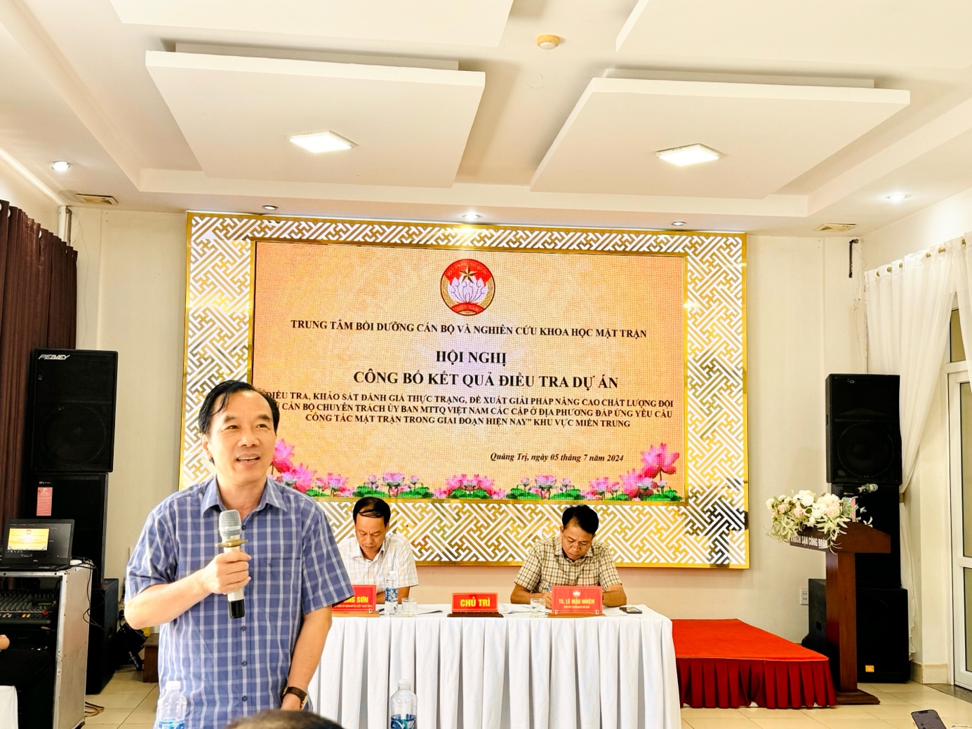 Chiều ngày 5/7/2024, tại Đông Hà, Trung tâm Bồi dưỡng cán bộ và Nghiên cứu khoa học MTTQ Việt Nam đã tổ chức Hội nghị Công bố kết quả điều tra dự án “Điều tra, khảo sát đánh giá thực trạng, đề xuất giải pháp nâng cao chất lượng đội ngũ cán bộ chuyên trách Uỷ ban MTTQ Việt Nam các cấp ở địa phương đáp ứng yêu cầu công tác Mặt trận trong giai đoạn hiện nay”.