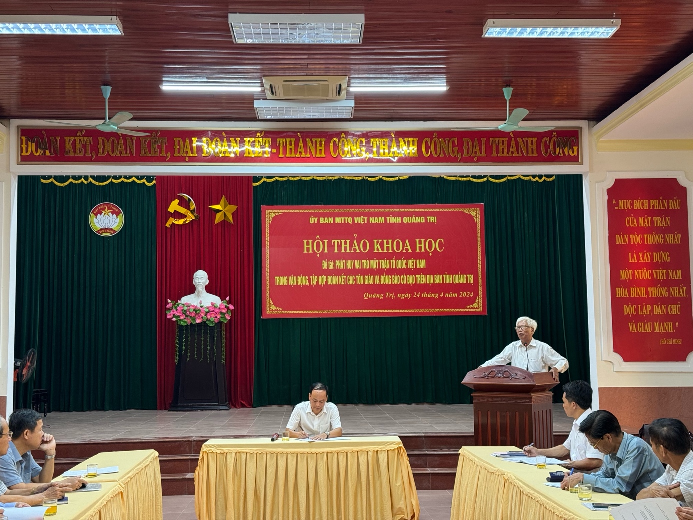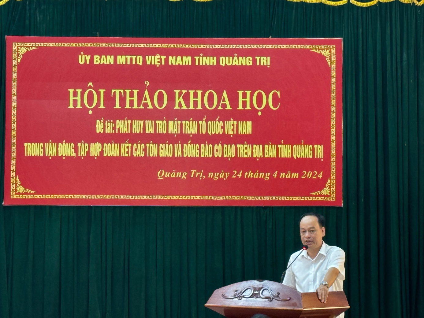 Ngày 24/4/2024, Ban Thường trực Uỷ ban MTTQ Việt Nam tỉnh đã tổ chức Hội thảo khoa học lấy ý kiến kết quả nghiên cứu đề tài khoa học công nghệ cấp tỉnh “Phát huy vai trò MTTQ Việt Nam trong vận động, tập hợp đoàn kết các tôn giáo và đồng bào có đạo trên địa bàn tỉnh Quảng Trị”. Đồng chí Lê Hồng Sơn, Phó Chủ tịch Uỷ ban MTTQ Việt Nam tỉnh, Chủ nhiệm đề tài chủ trì Hội thảo, tham dự Hội thảo có đại diện lãnh đạo các đơn vị, Uỷ ban MTTQ Việt Nam các huyện, thị xã, thành phố; các xã, phường, thị trấn và các nhà khoa học.