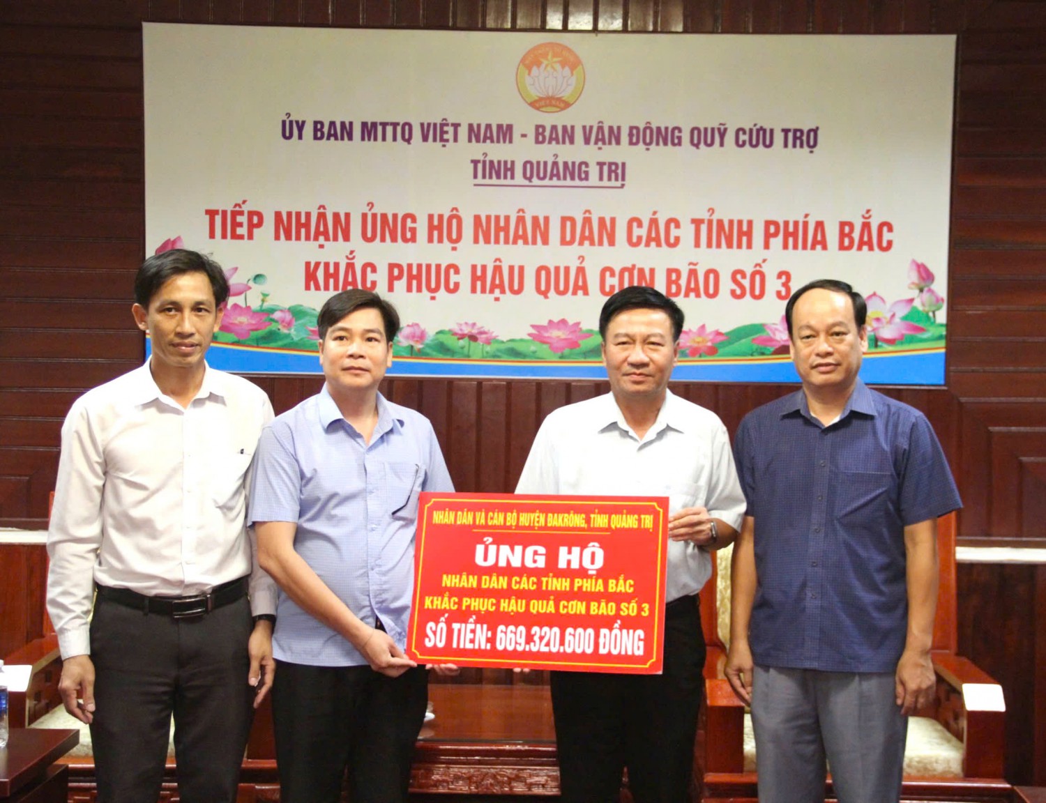 Chủ tịch Ủy ban MTTQ Việt Nam tỉnh Đào Mạnh Hùng cho biết, tỉnh Quảng Trị thường xuyên bị ảnh hưởng bão lũ. Bên cạnh việc chủ động triển khai các giải pháp ứng phó và khắc phục hậu quả bão số 4 gây ra ở các địa phương bị ảnh hưởng, tỉnh Quảng Trị tiếp tục triển khai công tác vận động các cơ quan, đơn vị, địa phương, doanh nghiệp và người dân ủng hộ đồng bào các tỉnh, thành phố phía Bắc khắc phục hậu quả do bão số 3 gây ra.