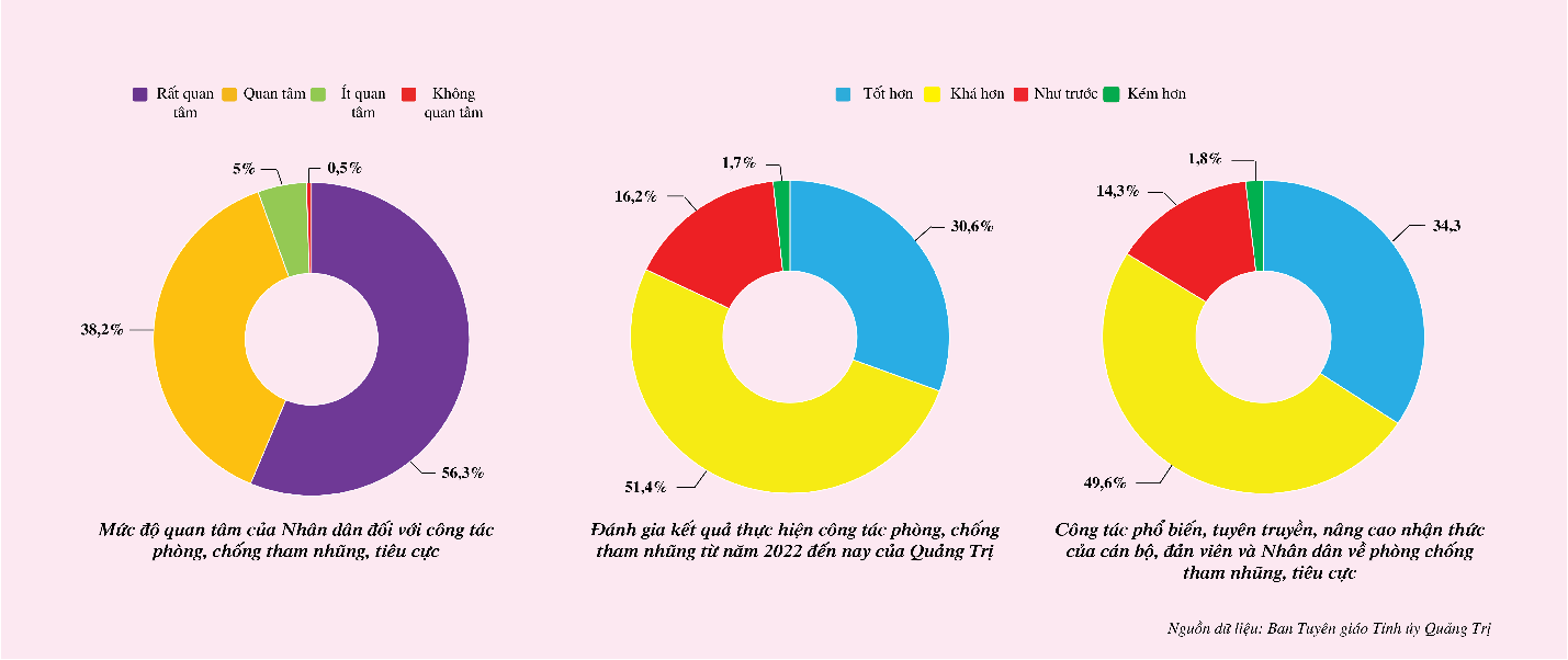 Tháng 5 năm 2023, Ban Tuyên giáo Tỉnh ủy Quảng Trị tổ chức cuộc điều tra về “hiệu quả công tác phòng chống tham nhũng, tiêu cực trên địa bàn tỉnh”, với 3.746 mẫu phiếu điều tra cho cán bộ, đảng viên và các tầng lớp nhân dân trên địa bàn 9 huyện, thị, thành phố trong tỉnh. Qua kết quả điều tra, cho thấy nhiều chỉ số đáng quan tâm. Trước hết có thể kể đến chỉ số về mức độ quan tâm của các tầng lớp nhân dân đối với công tác phòng, chống tham nhũng, tiêu cực chiếm đến 94,5% ý kiến. Mức độ tin tưởng của Nhân dân vào cuộc đấu tranh phòng, chống tham nhũng, tiêu cực khá cao (87%). Khi đánh giá kết quả thực hiện công tác phòng, chống tham nhũng từ năm 2022 đến nay của Quảng Trị, từ 77% đến 82% đánh giá tốt hơn và khá hơn; 83,9% cho rằng công tác phổ biến, tuyên truyền, nâng cao nhận thức của cán bộ, đảng viên, Nhân dân về phòng chống tham nhũng, tiêu cực khá hơn và tốt hơn trước.