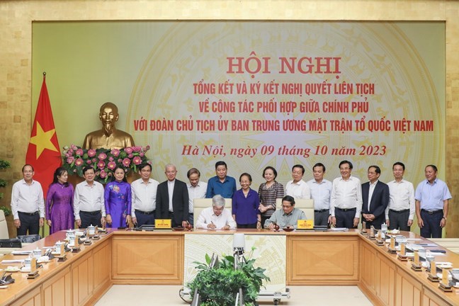 Thủ tướng Chính phủ Phạm Minh Chính và Chủ tịch Uỷ ban Trung ương MTTQ Việt Nam Đỗ Văn Chiến đã cùng ký kết Nghị quyết liên tịch về công tác phối hợp giữa hai bên
