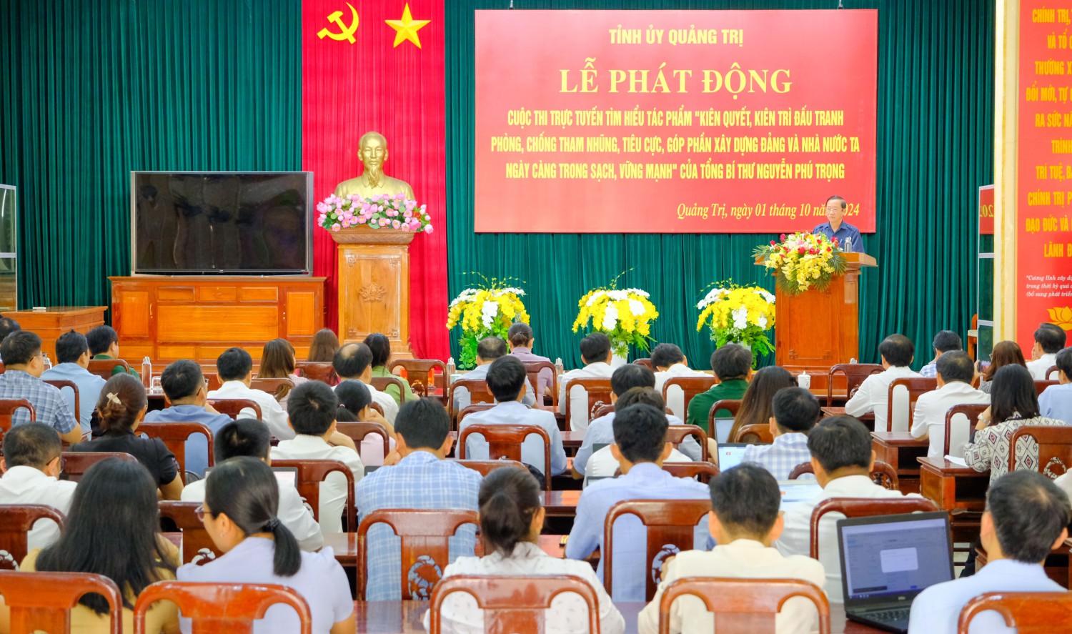 Sáng nay 1/10, Ban Thường vụ Tỉnh ủy Quảng Trị tổ chức lễ phát động cuộc thi trực tuyến tìm hiểu tác phẩm “Kiên quyết, kiên trì đấu tranh phòng, chống tham nhũng, tiêu cực, góp phần xây dựng Đảng và Nhà nước ta ngày càng trong sạch, vững mạnh” của Tổng Bí thư Nguyễn Phú Trọng (cuộc thi). Trưởng Ban Tuyên giáo Tỉnh ủy Hồ Đại Nam; Chủ nhiệm Ủy ban Kiểm tra Tỉnh ủy Hồ Thị Thu Hằng; Trưởng Ban Nội chính Tỉnh ủy Ly Kiều Vân dự lễ.