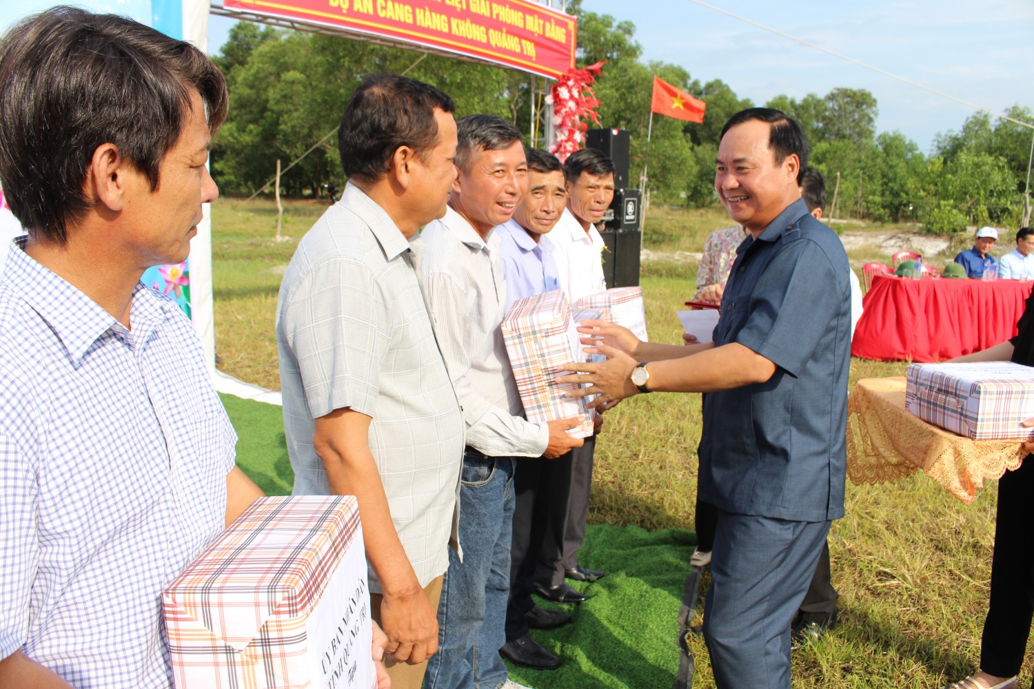 Dịp này, Chủ tịch UBND tỉnh Võ Văn Hưng đã trao tặng các suất quà động viên cán bộ, Nhân dân bị ảnh hưởng bởi dự án Cảng hàng không Quảng Trị trên địa bàn các xã Gio Mai, Gio Quang, Gio Hải. Đồng thời đi thực địa, kiểm tra công tác GPMB, di dời lăng mộ, cây xanh của chính quyền địa phương và người dân ngay sau lễ phát động.