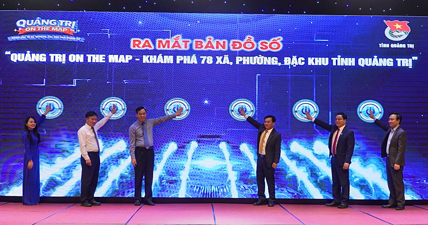 Các đại biểu thực hiện nghi thức ra mắt Bản đồ số Quảng Trị on the map