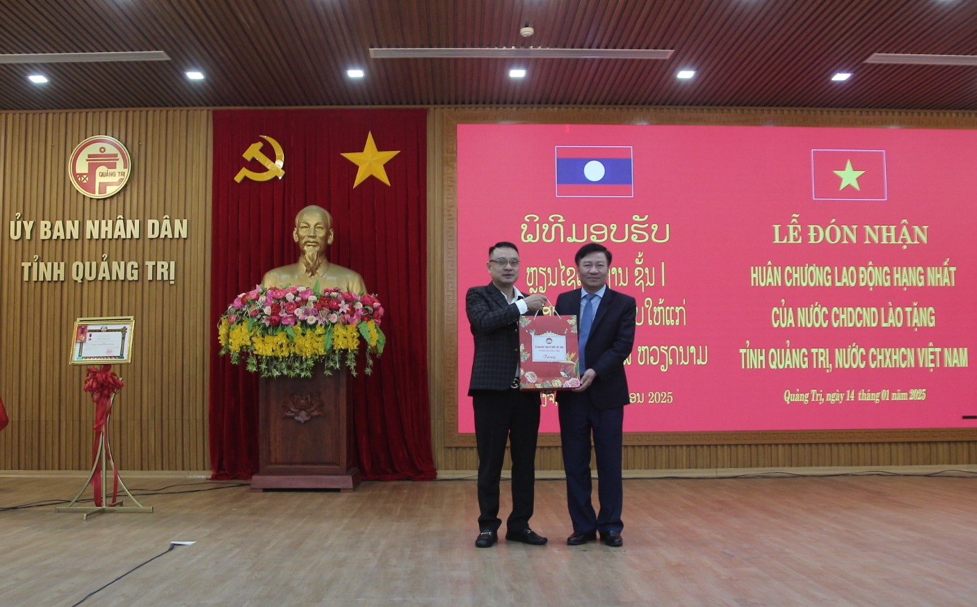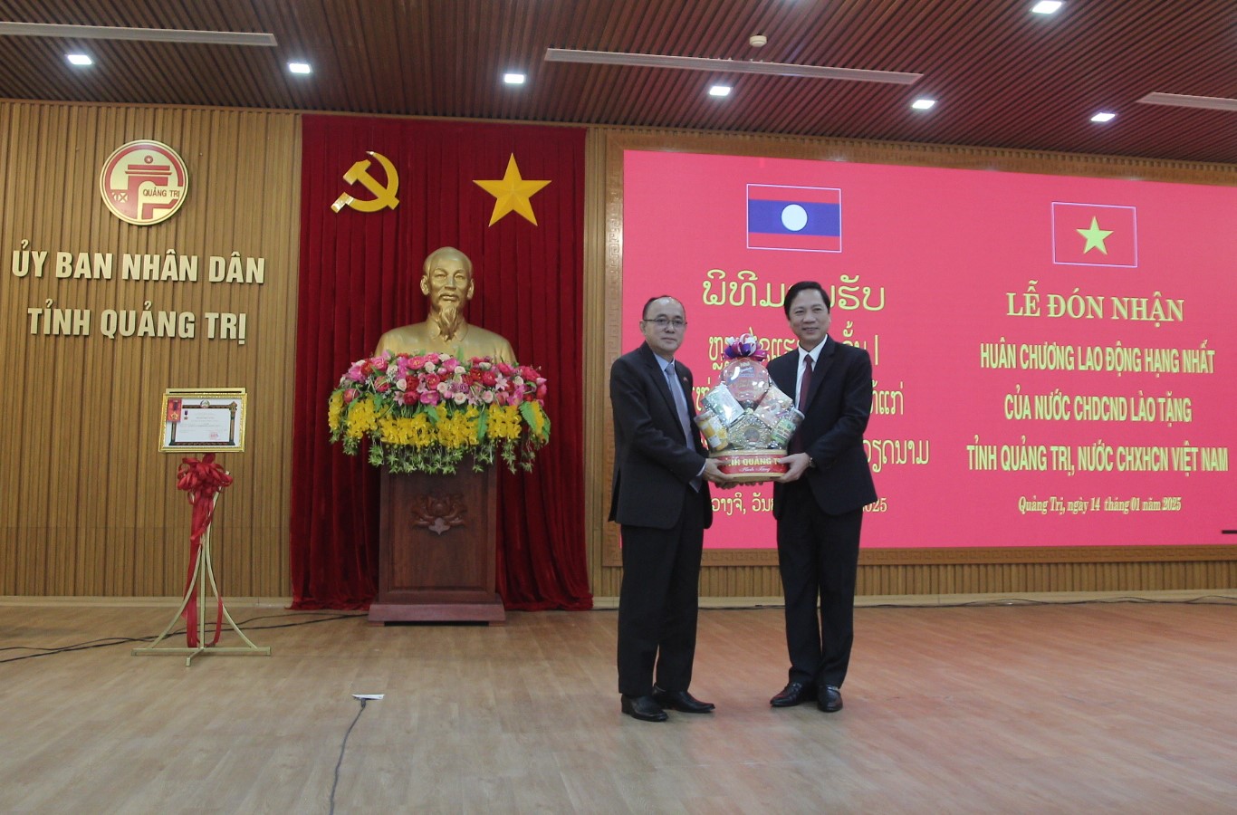Chiều ngày 14/1, tại TP. Đông Hà, Đoàn đại biểu tỉnh Champasak (Lào) do Phó Tỉnh trưởng, Chủ tịch Hội Hữu nghị Lào – Việt Nam tỉnh Champasak Somboun Heuangvongsa làm trưởng đoàn thừa ủy quyền của Đảng, Nhà nước Lào sang trao tặng Huân chương Lao động hạng Nhất của Chủ tịch nước CHDCND Lào cho tỉnh Quảng Trị và chúc mừng lãnh đạo tỉnh Quảng Trị nhân dịp Tết cổ truyền của dân tộc Việt Nam. Phó Chủ tịch UBND tỉnh Hoàng Nam; Phó Chủ tịch Thường trực HĐND tỉnh Nguyễn Chiến Thắng; Chủ tịch Ủy ban MTTQ Việt Nam tỉnh Đào Mạnh Hùng; Chủ nhiệm UBKT Tỉnh ủy Hồ Thị Thu Hằng tiếp đoàn.